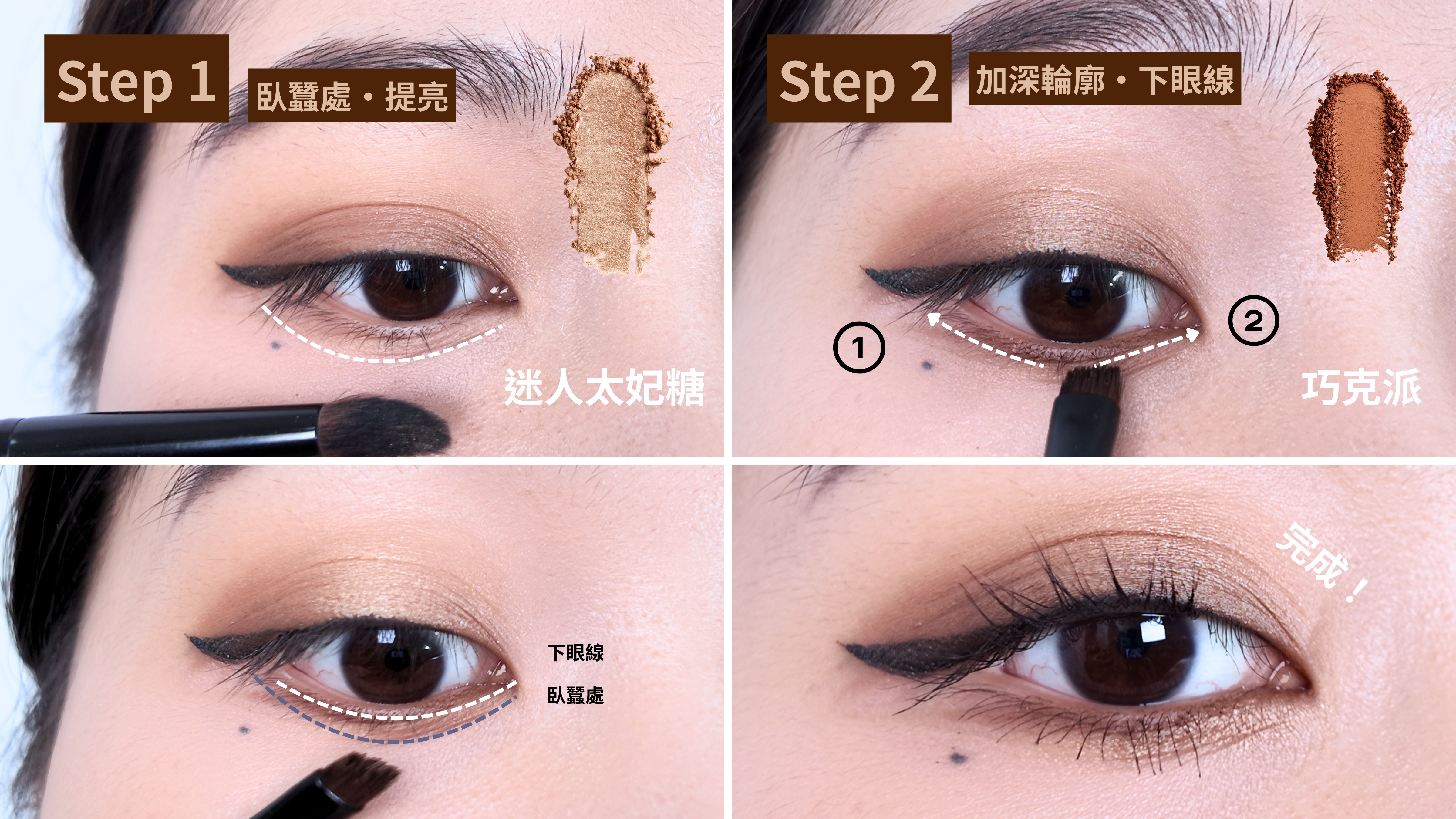 接下來,眼妝將部分將分成上半部分及下半部份介紹,一起來看看如何畫出深邃大地色的眼妝吧!
