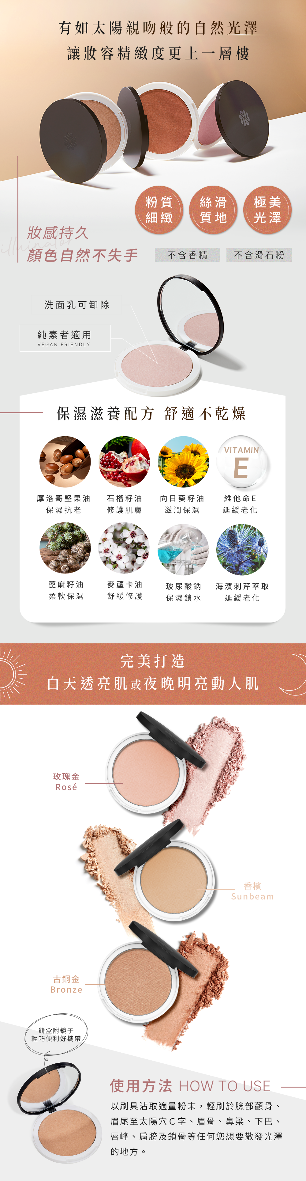 使用方法:輕掃於臉部頰骨,眼尾至眼下C字部位、鼻樑、下巴、唇峰、肩及胸口,或任何您想要散發光澤的地方。