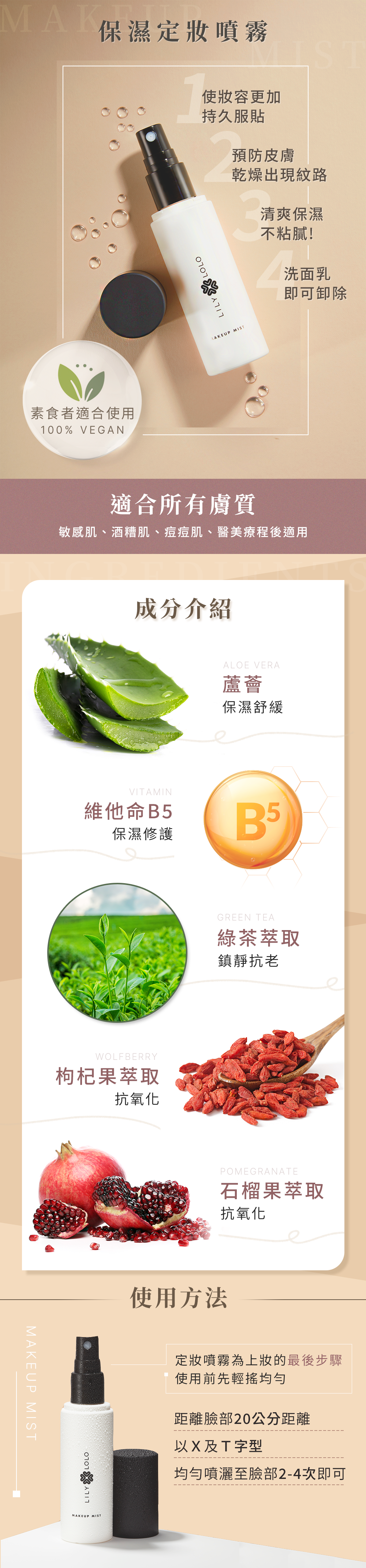全成份:AQUA (WATER), GLYCERIN, PANTHENOL, POTASSIUM SORBATE, SODIUM BENZOATE, ALOE BARBADENSIS (ALOE VERA) LEAF JUICE POWDER, CITRIC ACID, LYCIUM CHINENSE (GOJI BERRY) FRUIT EXTRACT, PUNICA GRANATUM (POMEGRANATE) FRUIT EXTRACT, CAMELLIA SINENSIS (GREEN TEA) LEAF EXTRACT, CITRUS GRANDIS (GRAPEFRUIT) FRUIT EXTRACT, BENZYL SALICYLATE. Vegan Friendly