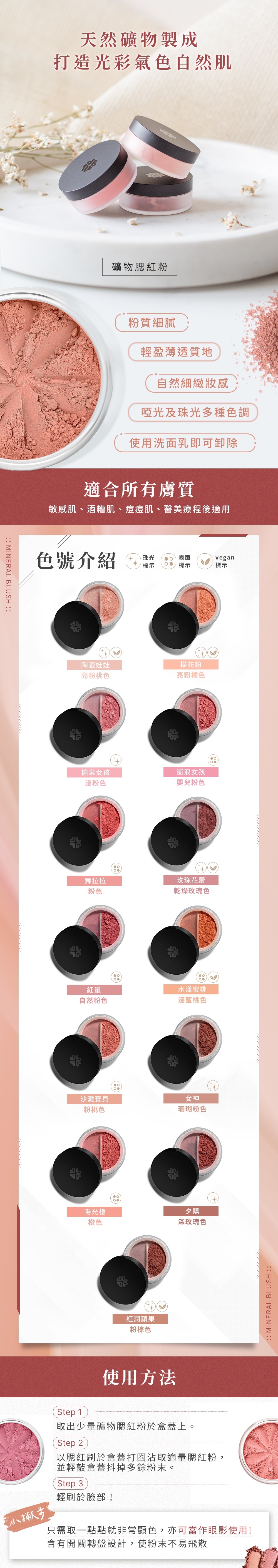 ※腮紅粉部分色號非純素,色號標示(V)者為純素適用(100% Vegan)