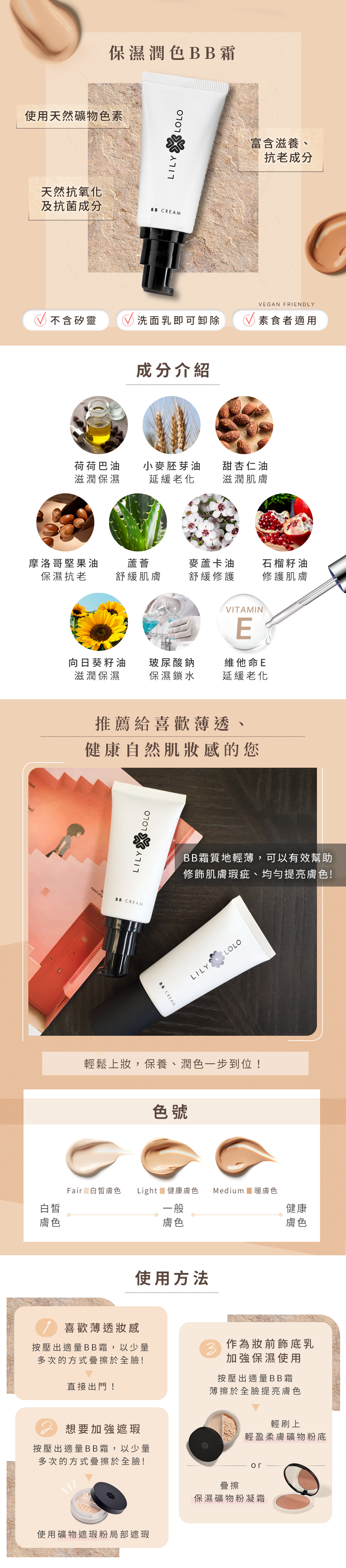 全成份:AQUA, CAPRYLIC/CAPRIC TRIGLYCERIDE, GLYCERIN, COCO-CAPRYLATE, CETEARYL OLIVATE, SORBITAN OLIVATE, SIMMONDSIA CHINENSIS (JOJOBA) SEED OIL, TRITICUM VULGARE (WHEAT) GERM OIL, PRUNUS AMYGDALUS DULCIS (SWEET ALMOND) OIL, ARGANIA SPINOSA (ARGAN) KERNEL OIL, STEARIC ACID, CETYL ALCOHOL, GLYCERYL STEARATE, BORON NITRIDE, BENZYL ALCOHOL, PARFUM, SODIUM BENZOATE, POTASSIUM SORBATE, TOCOPHEROL, ALOE BARBADENSIS LEAF JUICE POWDER, LEPTOSPERMUM SCOPARIUM (MANUKA) OIL, PUNICA GRANATUM (POMEGRANATE) SEED OIL, DEHYDROACETIC ACID, HELIANTHUS ANNUUS (SUNFLOWER) SEED OIL, SODIUM HYALURONATE, LIMONENE, LINALOOL, BENZYL BENZOATE, BENZYL SALICYLATE, CI 77891 (TITANIUM DIOXIDE), CI 77491 (IRON OXIDE), CI 77492 (IRON OXIDE), CI 77499 (IRON OXIDE),Vegan friendly