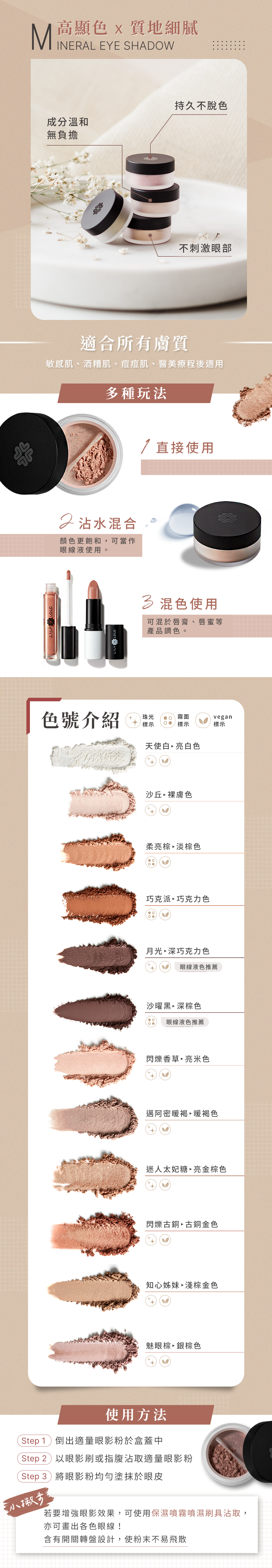 因使用礦物原料製成,霧面色號仍會有細緻的閃爍光,請確認後再購買,謝謝!