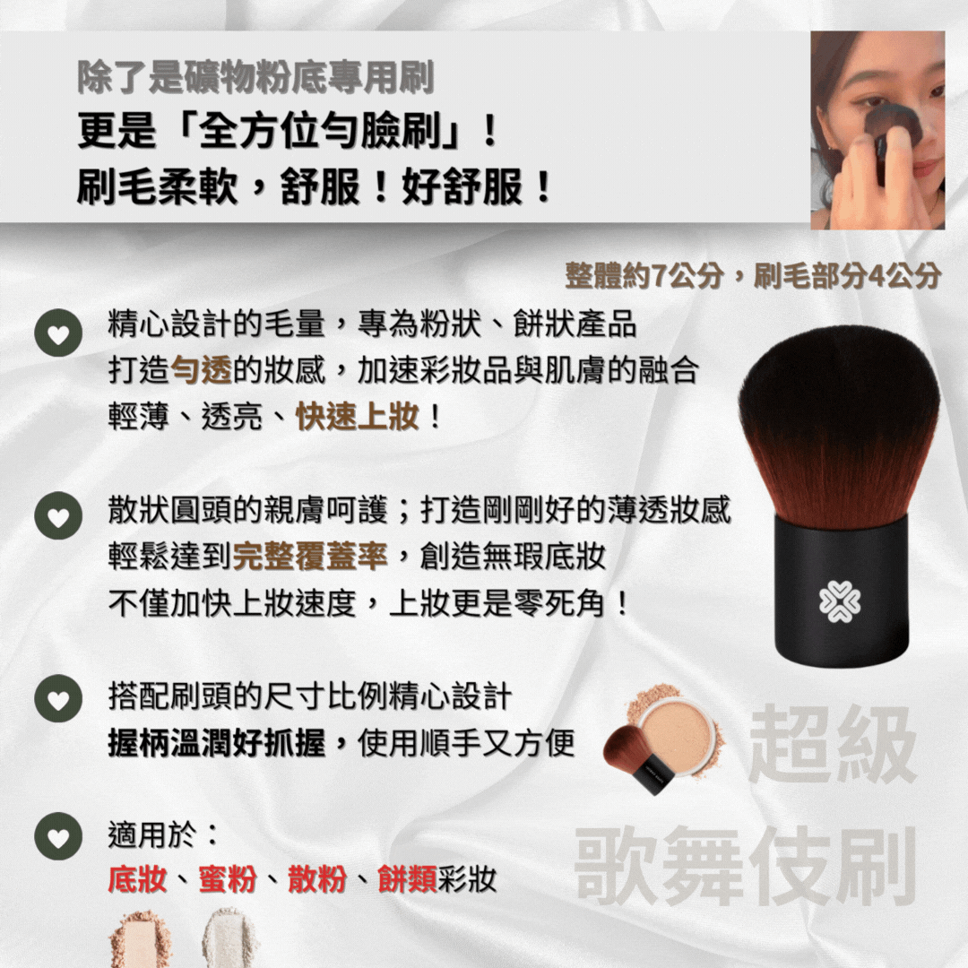 1.更均勻服貼:讓礦物粉底、餅狀、粉狀彩妝均勻服貼的刷在臉上